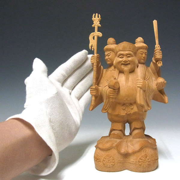 三面大黒天とは大黒天が正面に立ち毘沙門天と弁才天の二天がその背後から両手と顔をのぞかせる三天合体の像です。大黒天の左肩に大袋を背負い、米俵に立った姿で彫像されています。商売繁盛や田の神など縁起の良いものの代表として広く祀られています。