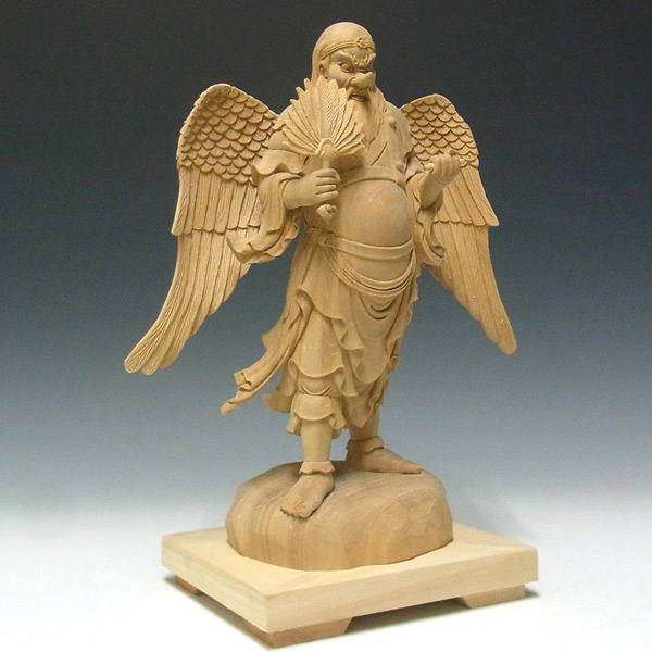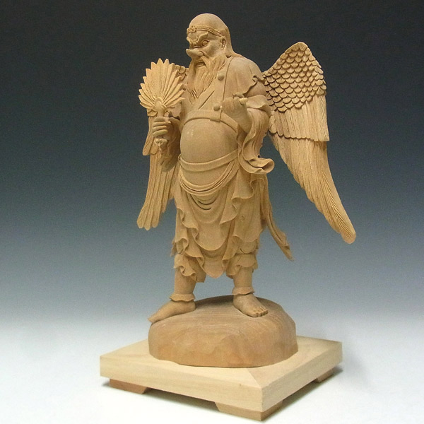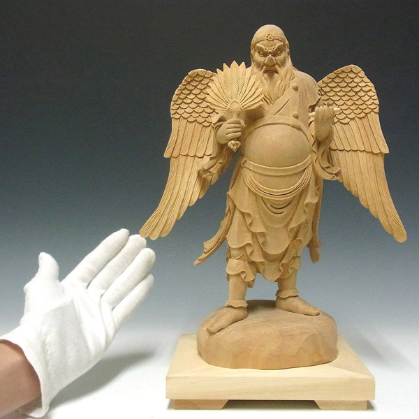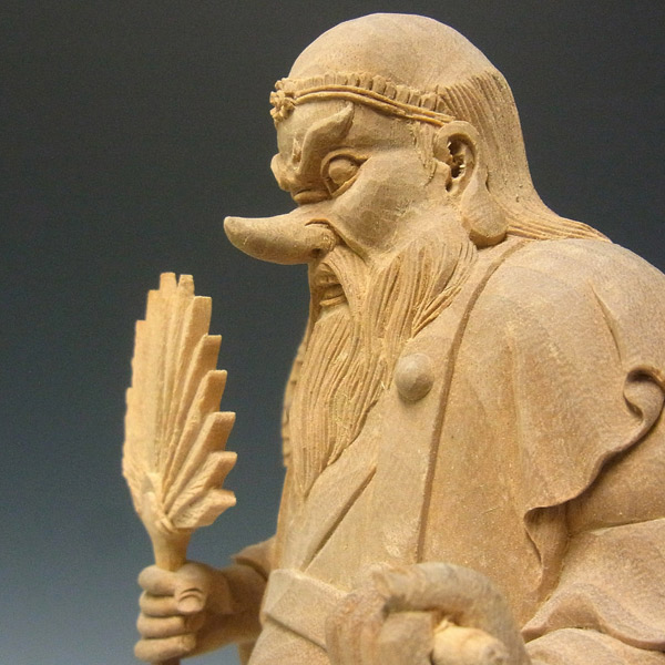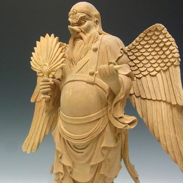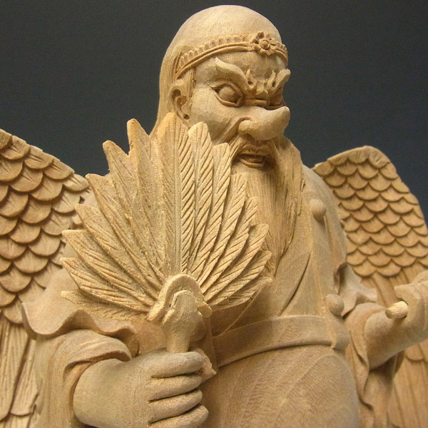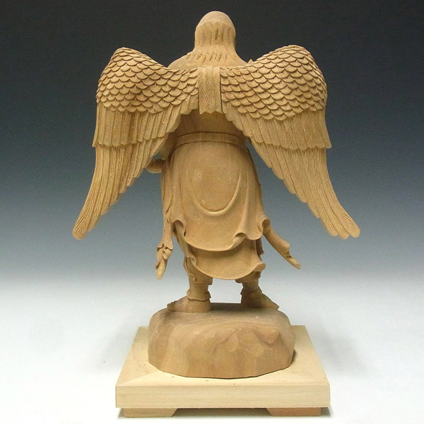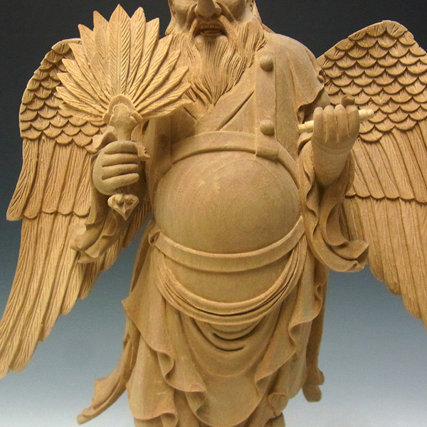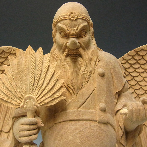 楠の白木から手彫りで彫り上げられた大天狗立像です。山伏の装束に動きを持たせた彫りは躍動感が感じられ、繊細な彫りの中にもダイナミックな大天狗の容姿がよく表現されています。