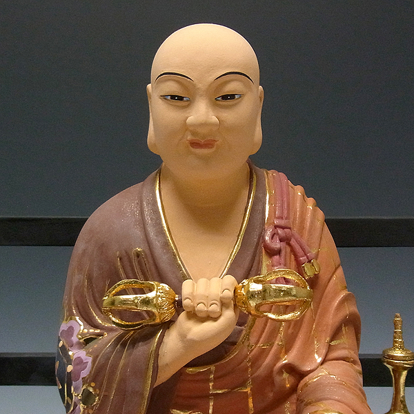 楠から彫り上げられ丁寧に彩色を施した 弘法大師空海坐像 です。弘法大師とは、平安初期の僧の空海のことで、空海は真言宗の開祖として知られています。遍照金剛ともよばれ、俗に「お大師さま」の呼び名でしたしまれています。