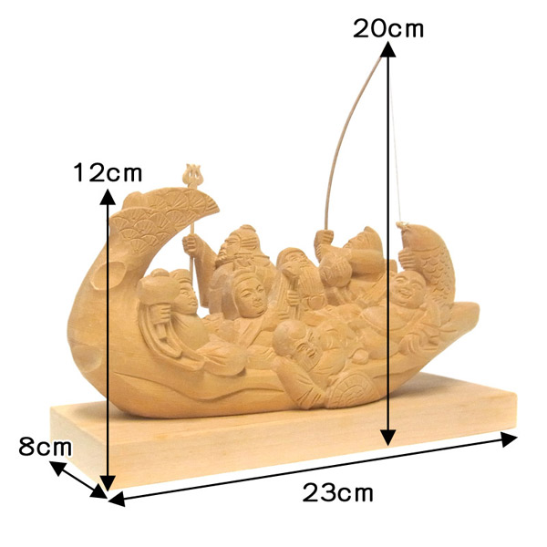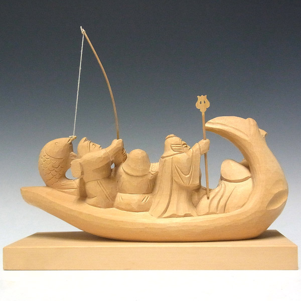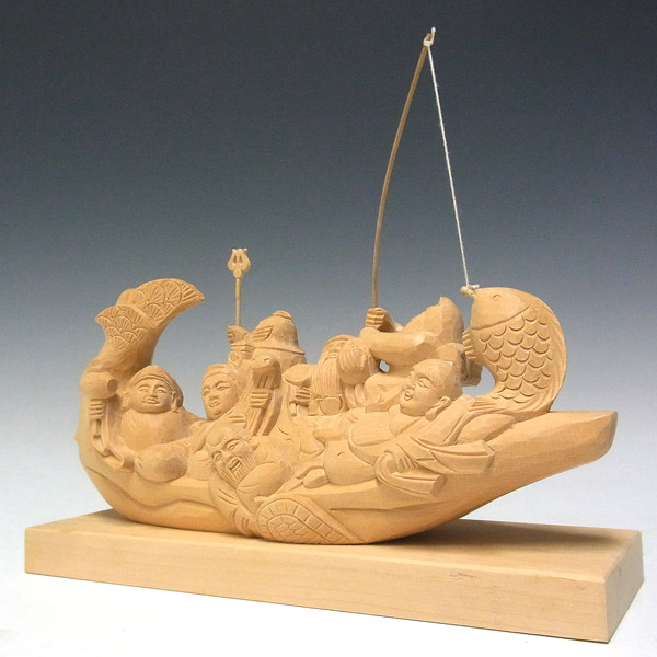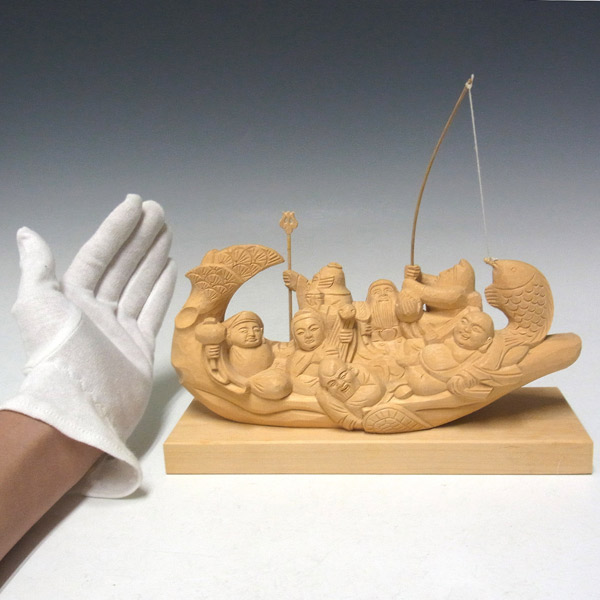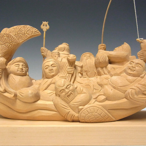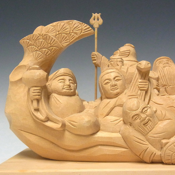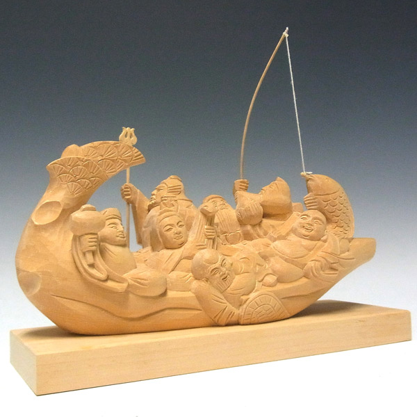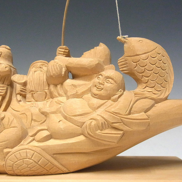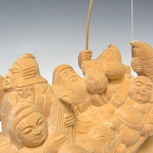 七福神1体1体が、丁寧に彫りこまれています。一同に集結した七福神船にそれぞれのスタイルで乗り込む七福神様たちがかわいく、賑わいが聞こえてきそうです。手頃なサイズなので、贈り物などにも喜ばれるでしょう。
