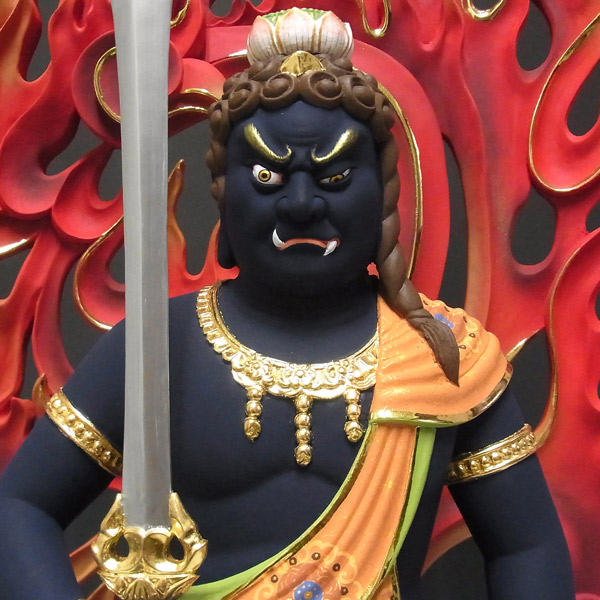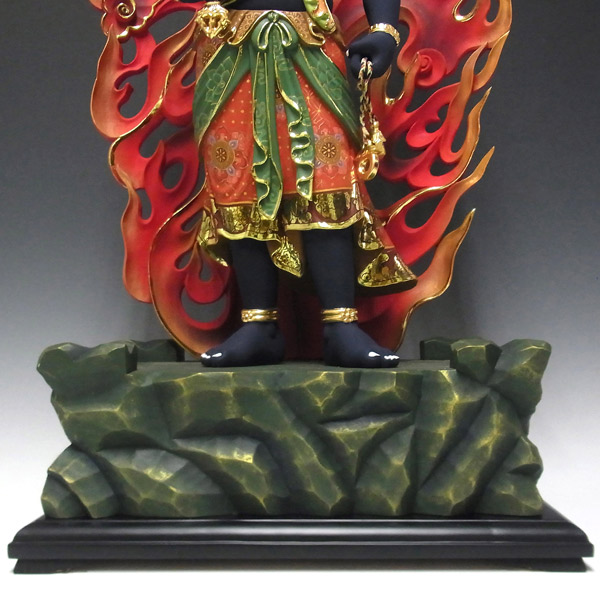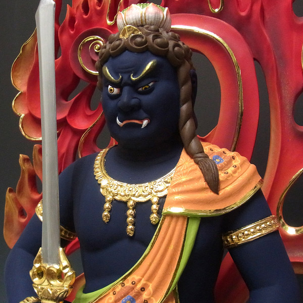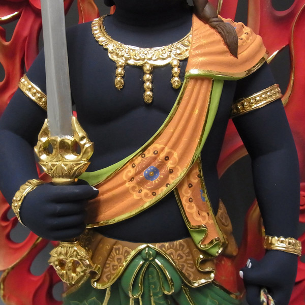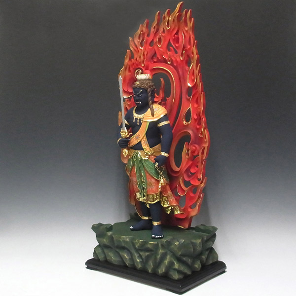 楠から手彫りで彫り上げられ、全体に彩色が施された不動明王立像です。