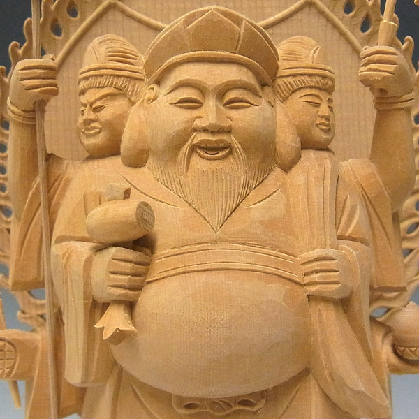 三面大黒天とは大黒天が正面に立ち毘沙門天と弁才天の二天がその背後から両手と顔をのぞかせる三天合体の像です。大黒天の左肩に大袋を背負い、米俵に立った姿で彫像されています。商売繁盛や田の神など縁起の良いものの代表として広く祀られています。