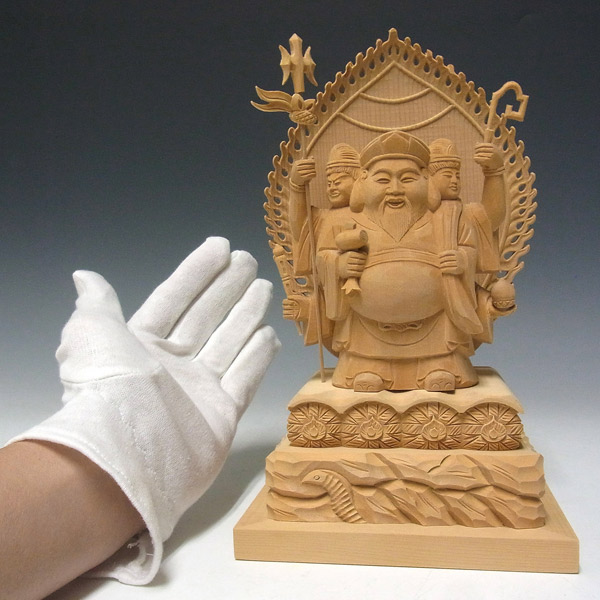 桧から手彫りで彫りあげられた三面大黒天立像です。