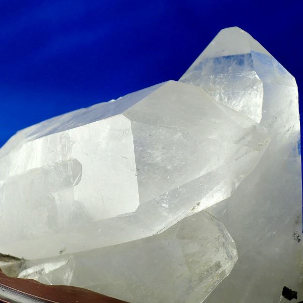 台付き水晶クラスターです。がっしりとした結晶で、 斜めに伸びたポイントと真っすぐ伸びたポイントが 交差する面白い形のクラスターです。 先端の透明度が高いです。