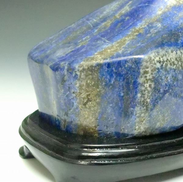 ラピスラズリの原石台付き全面磨きです。大きめの原石で全体を自然に磨いております。金のパイライトも入っております。青の色は明るめで大変高品質な一点です。