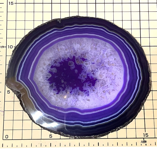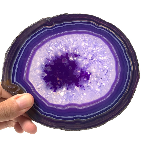染色することにより、色の濃淡ができ、メノウの縞模様がより一層美しくなります。置物を置いたり、鉱物を置いたりのインテリアとしてや、グラスなどを置くコースターとしてもお楽しみ頂けます。