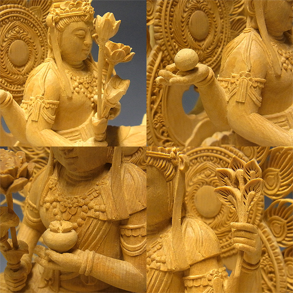 倶縁果(ぐえんか)・蓮花・吉祥果(きちじょうか)・孔雀尾をそれぞれ4本の手に持っています。孔雀明王は人間にとって毒である「苦しみ」・「災厄」・「煩悩」を取り除く功徳があると伝えられています。また、毒を持つ生物を食べる=人間の煩悩の象徴である三毒(貪り・嗔り・痴行)を喰らって仏道に成就せしめる功徳があるともいわれています。