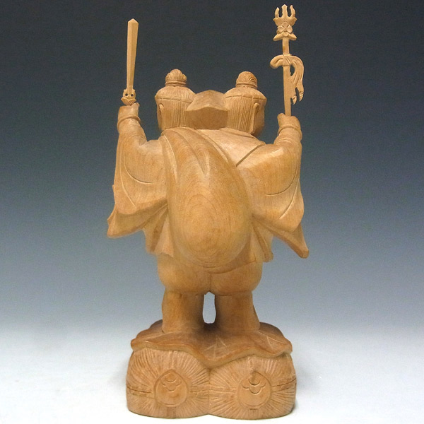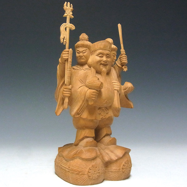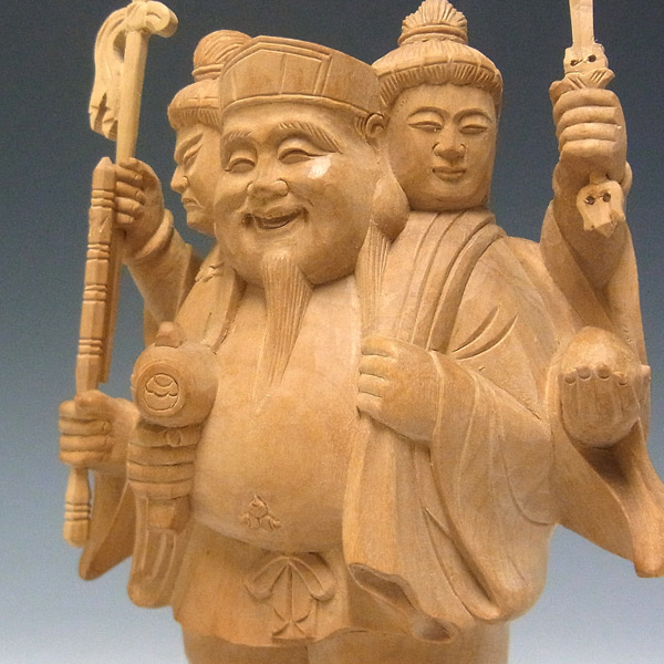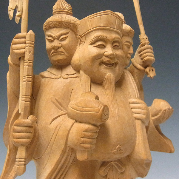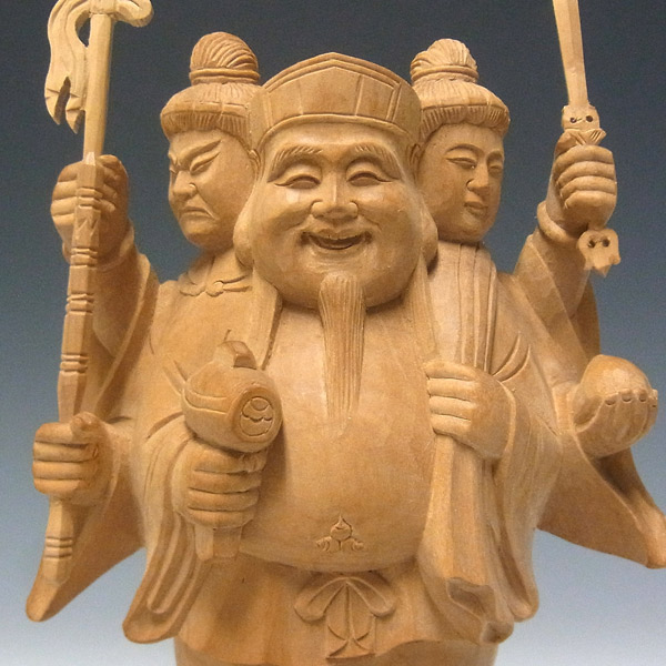 三面大黒天とは大黒天が正面に立ち毘沙門天と弁才天の二天がその背後から両手と顔をのぞかせる三天合体の像です。大黒天の左肩に大袋を背負い、米俵に立った姿で彫像されています。商売繁盛や田の神など縁起の良いものの代表として広く祀られています。
