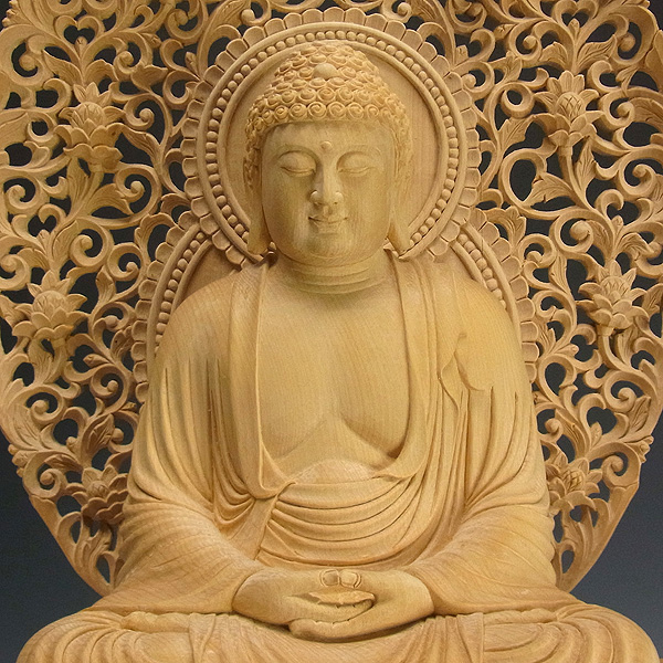 膝上で法界定印(禅定印)を結んだ坐像で彫像されています。光背には唐草光背があしらわれています。最高の材料と最上の彫りは写真を通してもお分かりいただけるかと思います。