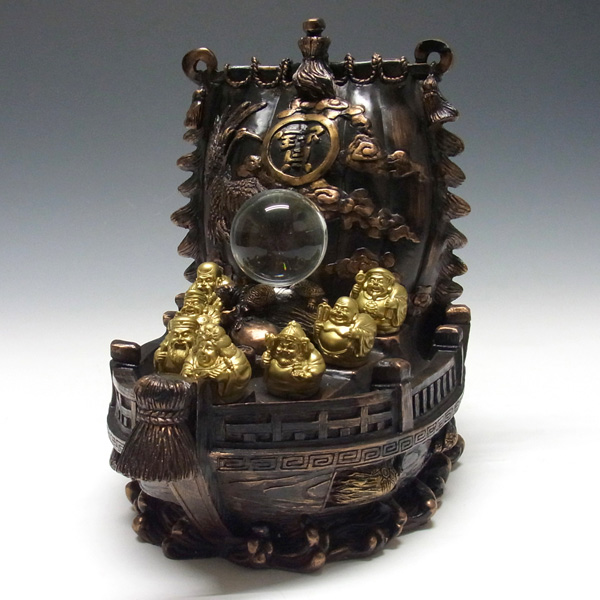 縁起物の大人気アイテム七福神の宝船です。なかなかの大きさがあり、どこに置かれても恥ずかしくのない豪華な一点です。 重厚感のある落ち着いた色合いです。宝船には鶴や亀、米俵と縁起物があしらわれています。誰もが知っている七福神ですから贈り物などにも喜ばれると思います。