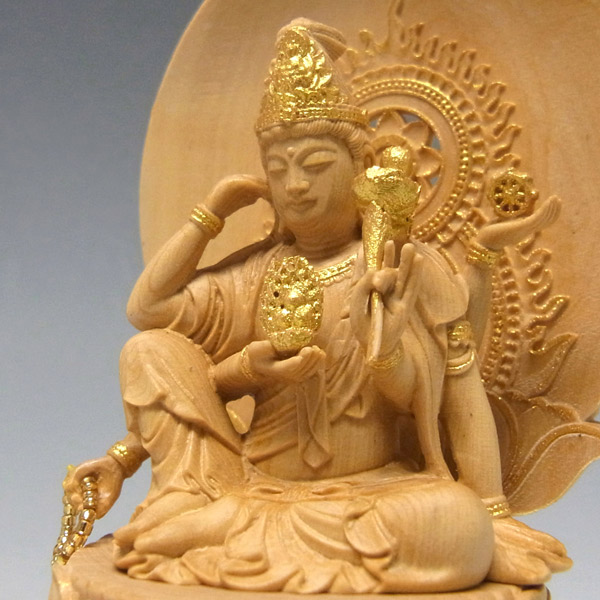 如意輪観音は人々を苦悩から救い、あらゆる願いを叶える観音菩薩です。また、煩悩を打破しようとする物質・精神面に功徳を与える菩薩でもあります。「如意」とは意のままに智慧や財宝、福徳もたらす如意宝珠という宝の珠のことであり、「輪」は煩悩を打ち砕く法輪を指しています。片膝を上げ、そこに肘をかけて指先を頬に当てているのは思惟の姿です。足裏は両方を合わせており、これは輪王座と呼ばれる姿勢で、どうすれば人々を救えるのかと悩んでいる姿だとされています。
