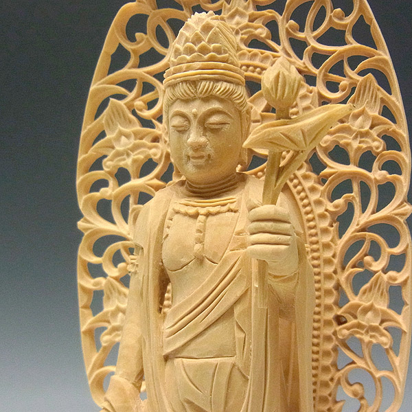 高級銘木である柘植から手彫りで彫り上げられた観音菩薩立像です。