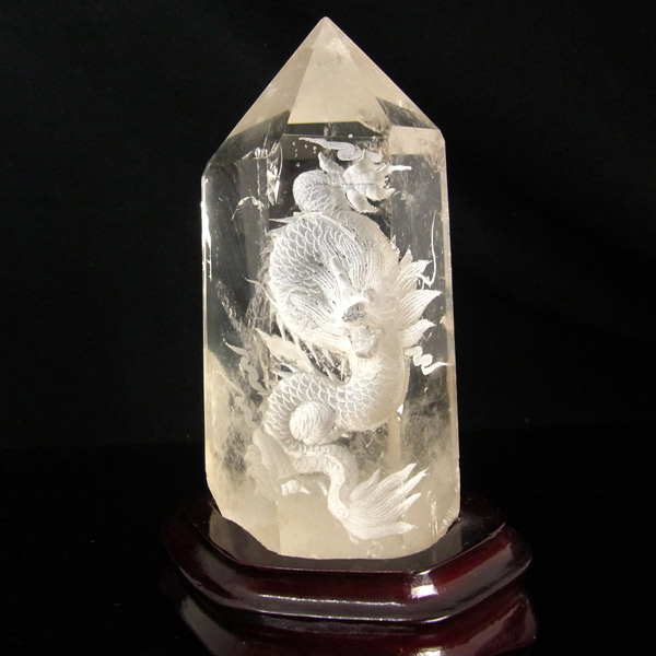 龍彫り水晶ポイントです。水晶の裏から龍を彫っています。透明感のあるきれいな水晶ポイントのに丁寧に龍が彫り込まれた一品です。上質な透明な水晶が非常にきれいです。水の生き物である龍には水晶が相性抜群。風水や縁起物としておススメです。