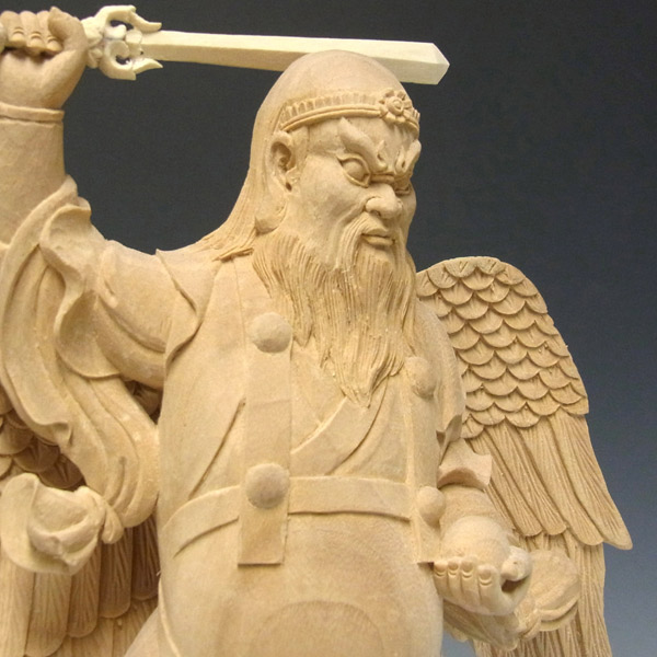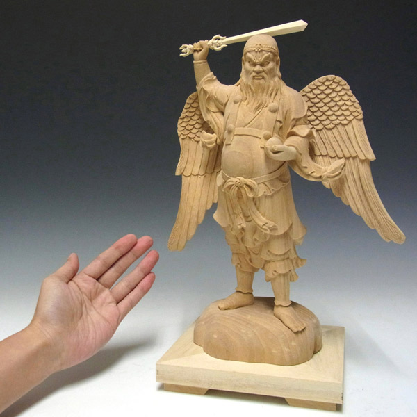 楠の白木から手彫りで彫り上げられた小天狗立像です。山伏の装束に動きを持たせた彫りは躍動感が感じられ、繊細な彫りの中にもダイナミックな小天狗の容姿がよく表現されています。