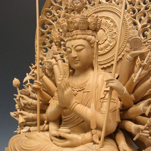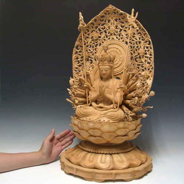 榧から彫られた千手観音菩薩坐像です。総高が62cmと坐像にしては大きいサイズ。特注以外では出回らない大きさです。 最上級の彫り、木目もきれいで状態も良好です。腕、光背は差し込みになります。