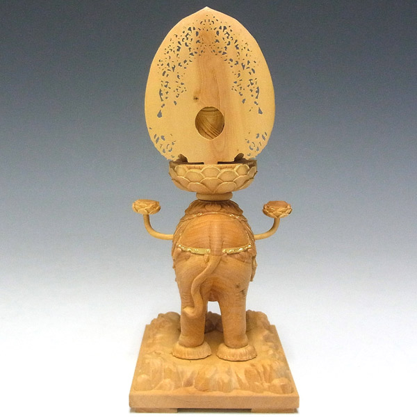 普賢とは「全てにわたって賢い者」という意味で、あらゆるところに現れ命ある者を救う行動力のある菩薩で、白象に乗っている姿が一般的です。文殊菩薩の智慧とともに修行を司る菩薩として、明晰な智慧で掴み取った仏道の教えを実践していく役割を果たすとされています。また、女性の救済を説く法華経の普及とともに女性に多く信仰を集めました。 文殊菩薩とともに釈迦如来の右脇侍として三尊で並ぶことが多いですが、独尊で祀られる場合もあります。女性守護、修行者守護、息災延命、幸福を増やす増益のご利益があるとされています。また、辰・巳年の守り本尊です。