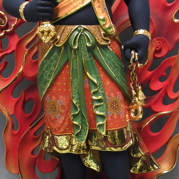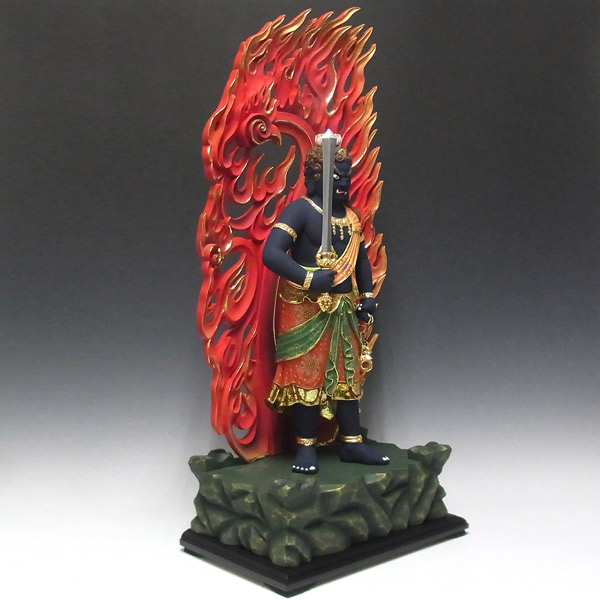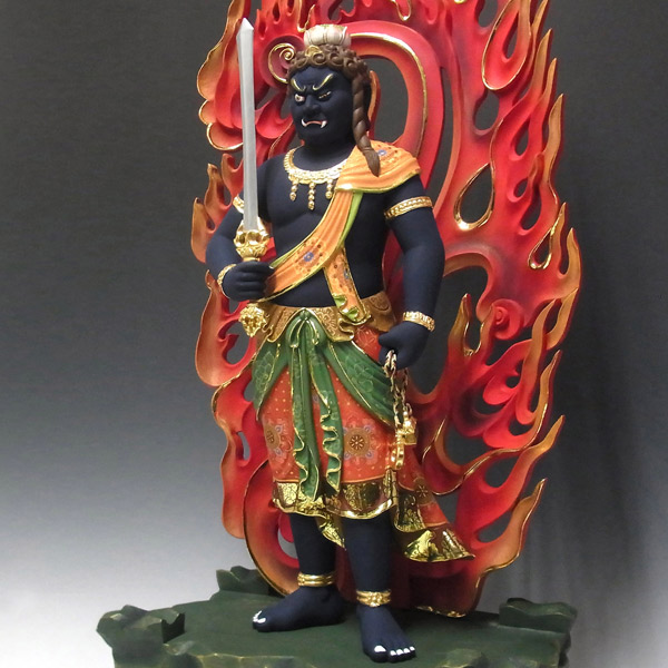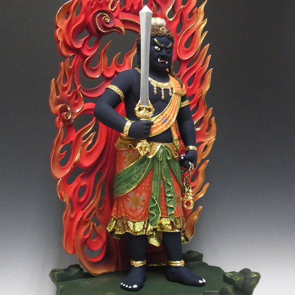 楠から手彫りで彫り上げられ、全体に彩色が施された不動明王立像です。