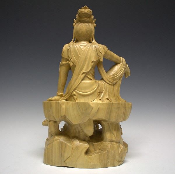 本作は、遊戯坐像と呼ばれるゆったりとした構えで、滝の流れを見つめる観音菩薩の姿が彫像された一品です。滝のしぶきが煩悩を消し去って行くさまを象徴しているとされます。