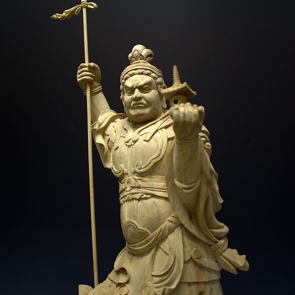 ■本作は、当社が取り扱う毘沙門天像の中でも特に彫りの良い一品です。均整の取れた全体像に、細かい部分までが丁寧に彫り込まれ、威風堂々とした像容です。