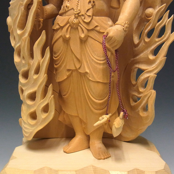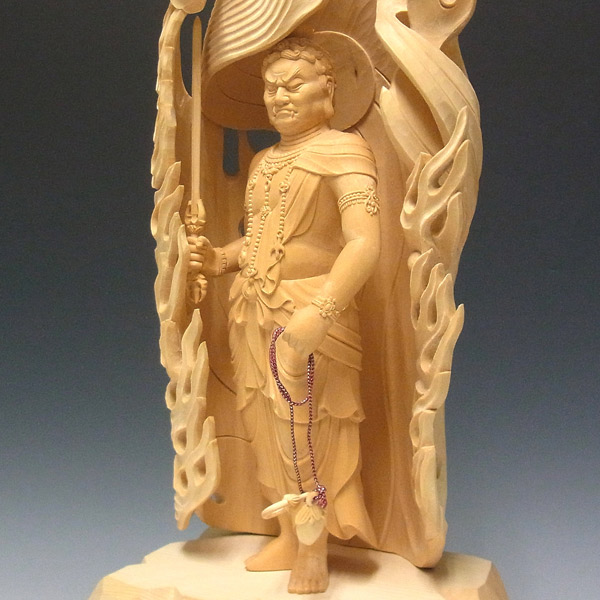総高は59cm、本体の高さは30cmと、大きめの造りに仕上げられています。光背である迦楼羅(かるら)炎が、荒々しく不動明王を包み込んだ圧巻の一体です。